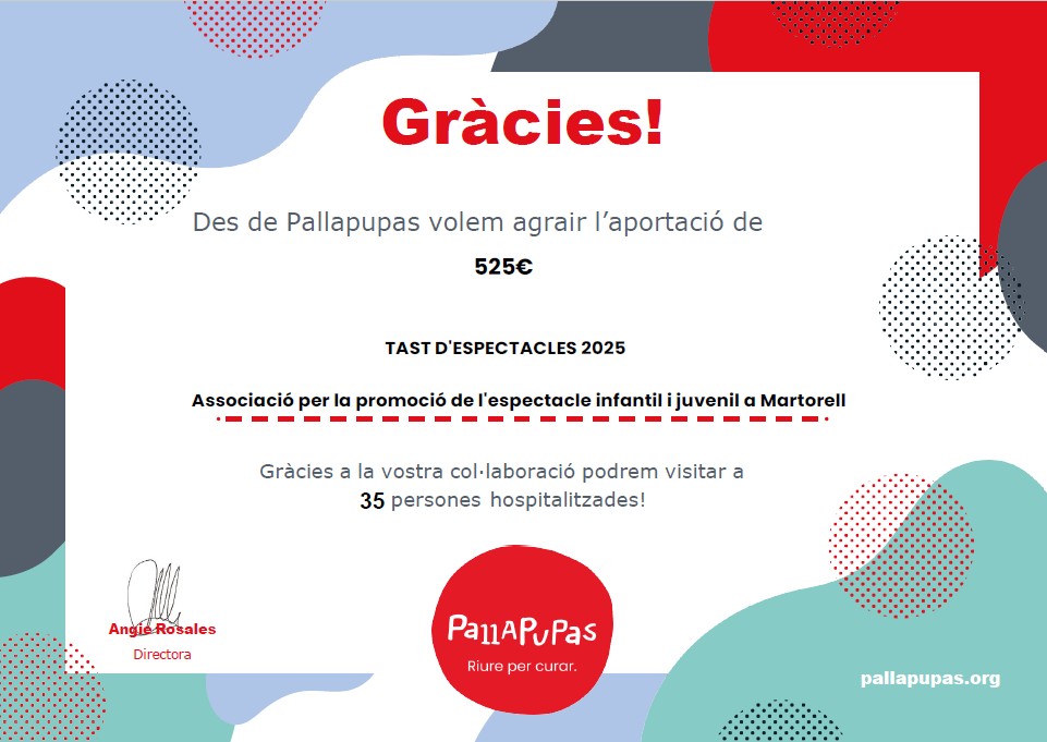 Gràcies al públic familiar que vau assistir al 14è Tast d'espectacles familiars hem pogut col·laborar amb Pallapupas, que porta somriures i abraçades a infants en situació de malaltia