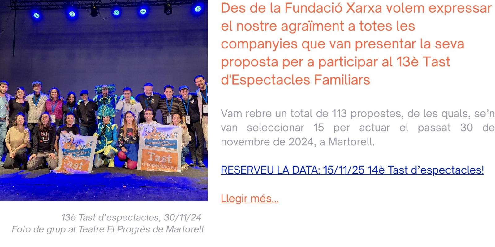 El proper 15 de novembre celebrarem la 14a edició del Tast d'Espectacles Familiars i farem entrega dels Premis Fundació Xarxa del Fitkam