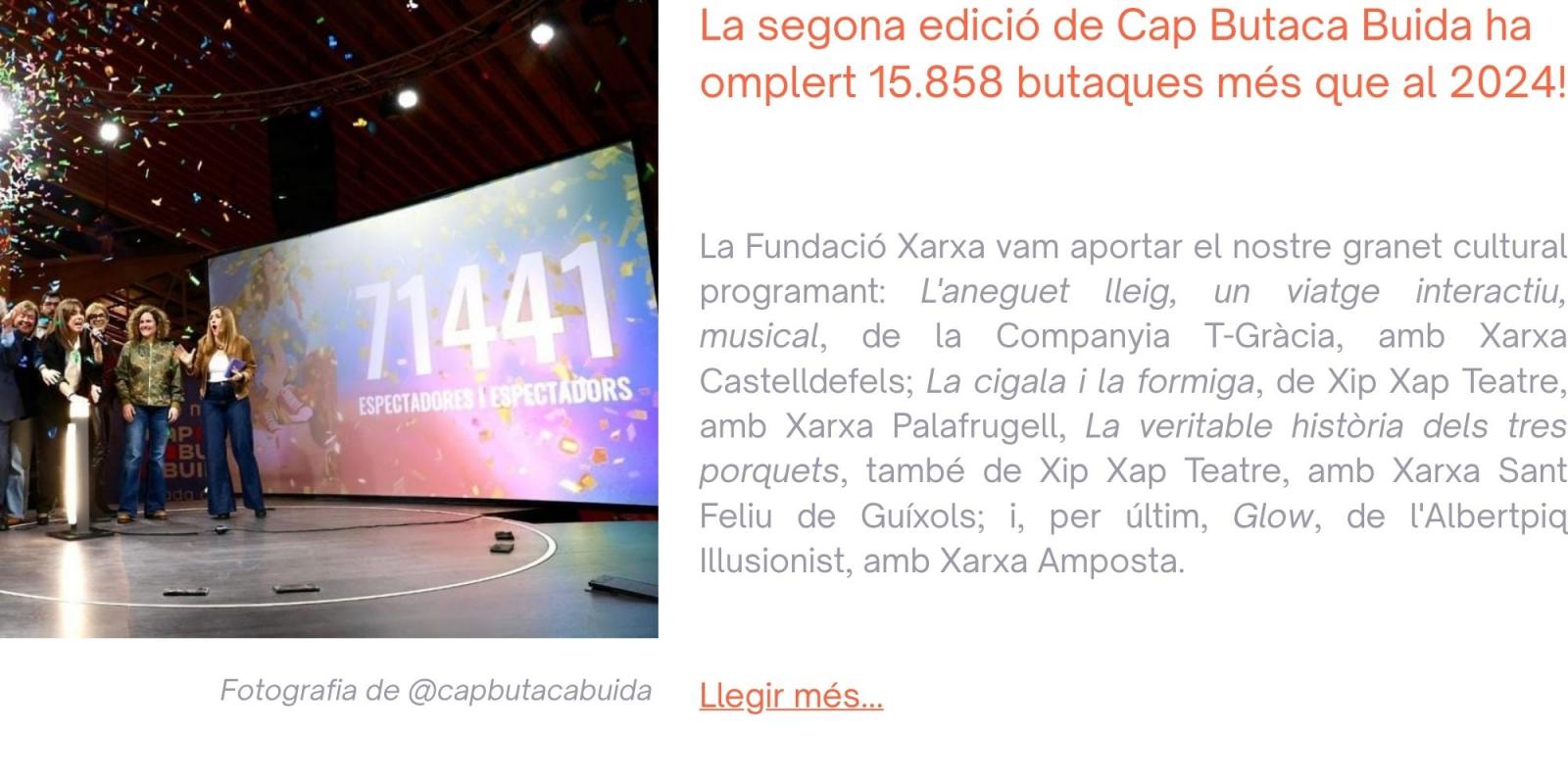 Fundació Xarxa engega nova temporada deixant un balanç de 100.000 espectadors en la temporada 2016-2017. Ja s’han programat més de 200 espectacles a 55 localitats abans de tancar la programació de la nova temporada. Podreu saber on hi ha Espectacles en Xarxa a través de l'agenda de la nostra web o mitjançant la nostra APP.