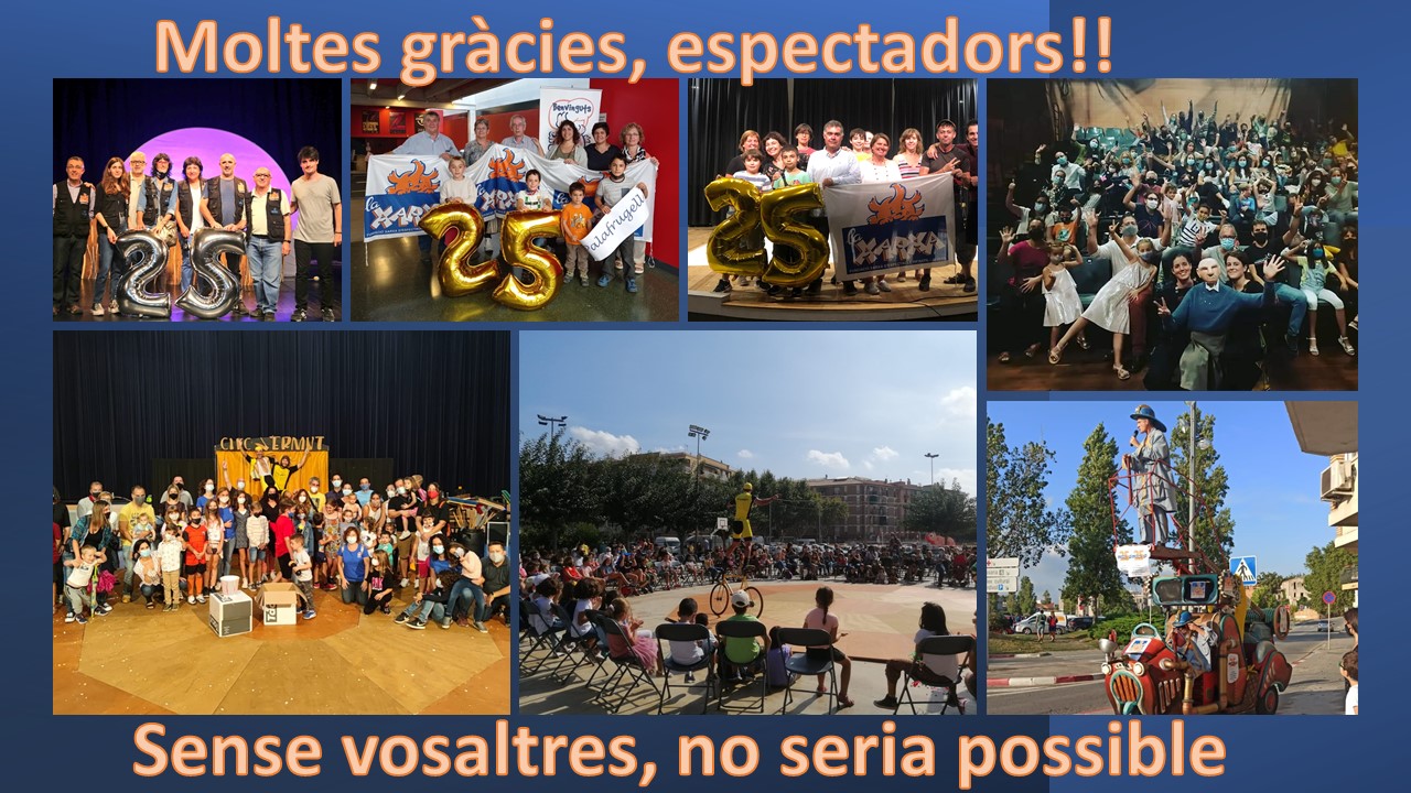 I, sobretot, felicitats al públic familiar que amb la seva presència han omplert els teatres de llavor de nous espectadors/es que veuran en en el "teatre" la vida d'un altre color. Com deia en Salvador Sunyer "ple de mentides que li ensenyaran les veritats".