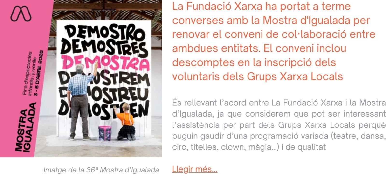 A pocs dies de l'inici de la 28a Mostra de Teatre Infantil i Juvenil, el grup de voluntaris de La Xarxa Igualada es prepara per dur a terme la seva tasca, un bon exemple del valor del voluntariat. Parlem amb el Francesc Rossell, cap de voluntaris de La Mostra, que en passeja per la història d'aquest esdeveniment i ens descobreix tots els seus secrets. Descobriu el contingut de l'entevista aquí.